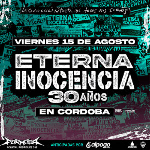 Este viernes 15 de agosto, Eterna Inocencia se presenta en Sala Formosa (Dr. T. Achával Rodríguez 349, Barrio Güemes) como parte de su gira nacional. El grupo, referente del punk rock argentino desde los años ’90, vuelve a Córdoba luego de recorrer distintos escenarios del país durante 2024.