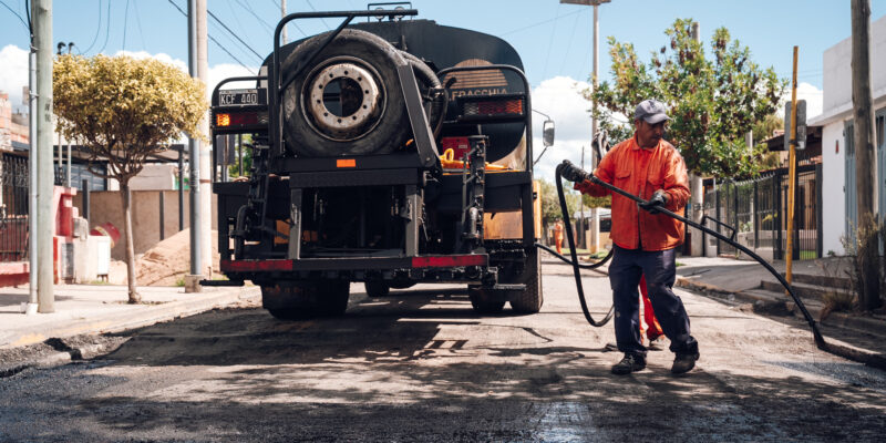 Bacheo con asfalto en la intersección de Cacheuta y Huiliches, al sur de la ciudad
